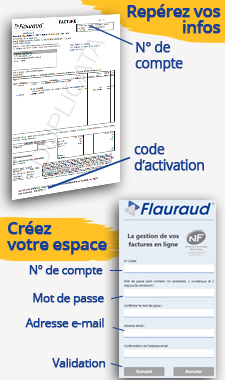 b. Votre code d’activation pour la dématérialisation. Ce code de 10 caractères est présent au bas de votre facture. Si vous ne le trouvez pas, demandez-le à vos interlocuteurs habituels ou par email à compta.clients@flauraud.fr