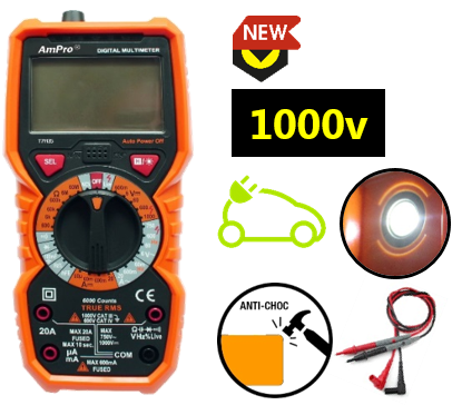 Préconisé pour les véhicules électriques et hybrides, ce multimètre avec lecture à valeur efficace TRUE RMS est équipé d’un auto Power Off ainsi qu’une lampe et un écran rétroéclairé. Ce produit est également doté d’un test en ligne, de continuité sonore, un test de diode et de condensateur et un détecteur de tension sans contact.