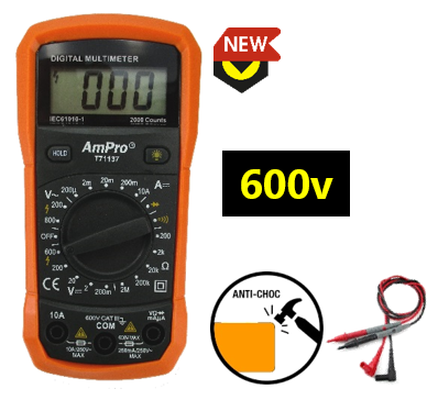 Livré avec son cordon et sa coque de protection, ce multimètre digital possède un écran rétroéclairé, une fonction continuité buzzer ainsi qu’un test de diode.