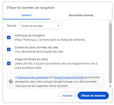 Sur le navigateur Chrome, utiliser le raccourci Ctrl+Maj+Suppr. La fenêtre ci-contre va s’ouvrir : sélectionnez et cliquez sur effacer les données.